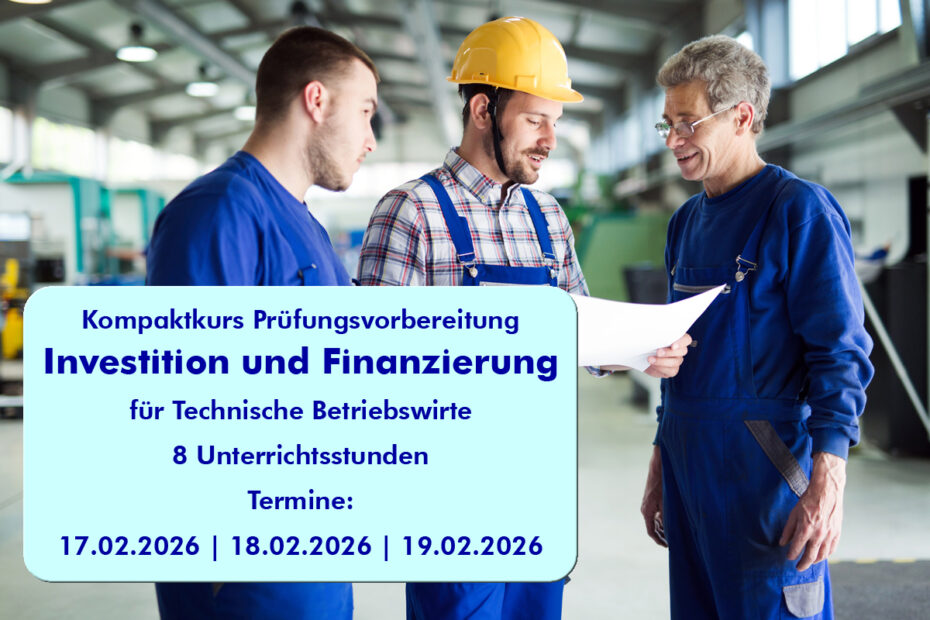 Das Fach Investition und Finanzierung zählt zu den prüfungsrelevantesten und zugleich anspruchsvollsten Themenfeldern in der Weiterbildung zum Technischen Betriebswirt. Fundierte Kenntnisse in Investitionsrechnung, Finanzierungsarten, Kostenvergleichen… Weiterlesen »Im Februar beginnt der Kompaktkurs „Investition und Finanzierung“ für Technische Betriebswirte