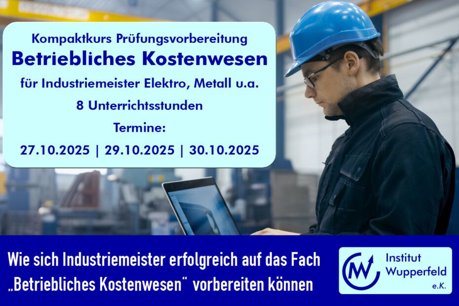 Mit der richtigen Vorbereitung und einem klaren System lässt sich auch ein anspruchsvolles Fach wie „Betriebliches Kostenwesen“ souverän meistern. Das Institut Wupperfeld bietet hierfür den passenden Rahmen: kompakt, praxisorientiert und effizient. Wer die Prüfung erfolgreich bestehen will, sollte auf eine strukturierte Vorbereitung setzen – und genau hier setzt dieser Kurs an.